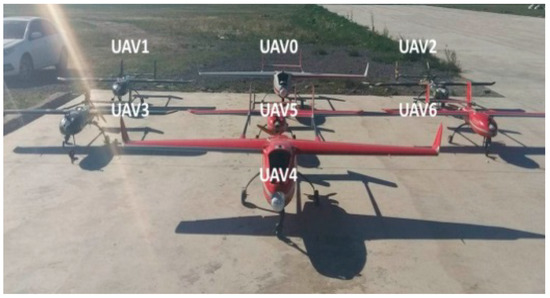 In order to observe the performance of the model and verify the effectiveness of the USCC stochastic system, we conducted an equivalent outfield autonomous formation flight test by using multiple UAVs. As shown in Figure 7, we carried out experiments with seven nonholonomic UAVs. The UAV swarm can cooperatively search the certain area with different configurations.