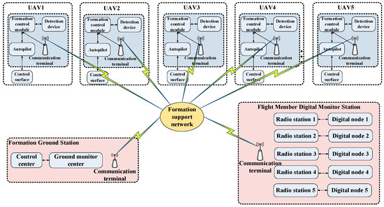The loads in each cabin of the UAV are shown in Figure 8, including the power module, formation cooperative guidance module, autopilot module, detection module, formation communication module and flight data transmission module. In the experiment, we adopted the proposed USCC stochastic model into the formation cooperative guidance module to instruct the flight members to reach the desired position and maintain a steady configuration. The framework of the whole system is shown in Figure 9.