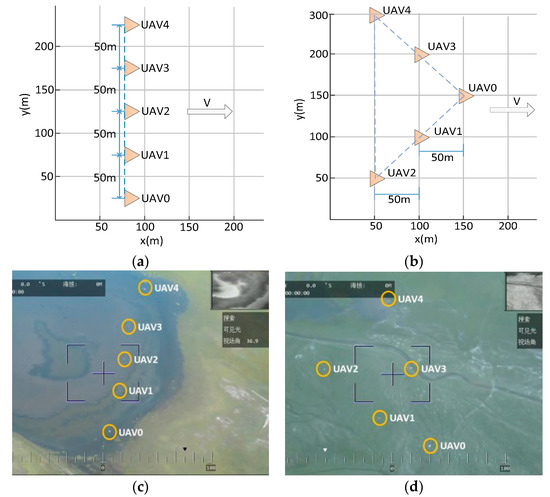 Two configurations of five drones we designed in the experiments are shown in Figure 10a,b. The lateral and forward distance between neighbor UAVs was set to 50 m. Moreover, the configurations in Figure 10c,d were captured by the UAV that was flying higher with a pod.