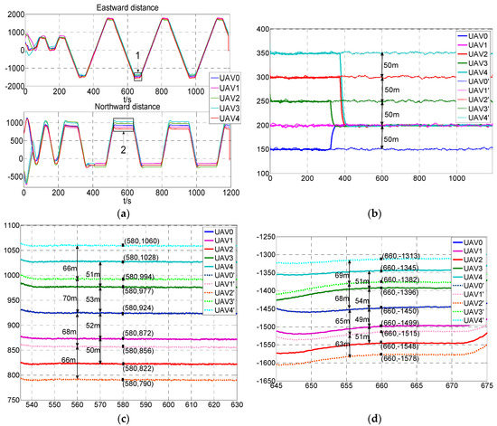 Experimental results of the wedge configuration. (a). The flight path of the five UAVs; (b). The height of five UAVs. The flight paths in full line belong to the UAV0 to UAV4 with USCC stochastic system model while the dotted line belong to the UAV0’ to UAV4’ are without the model; (c). Northward distances between the five UAVs which are indicated by “2” in (a). The flight paths in full line of UAV0 to UAV4 utilize the USCC stochastic system model while the dotted line of UAV0’ to UAV4’ do not use the model; (d). Eastward distances between the five UAVs which are indicated by “1” in (a). The flight paths in full line of UAV0 to UAV4 use USCC stochastic system model while the dotted line of UAV0’ to UAV4’ do not use the model.