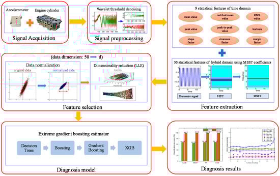 However, in-depth analysis has revealed that current data-driven methods for misfire fault diagnosis mainly utilize spectrum analysis, traditional wavelet decomposition, wavelet packet decomposition, and empirical mode decomposition to extract significant features [,,,,,,,,,,,,]. Restricted by the Heisenberg uncertainty principle, the classical processing methods suffer from a relatively low time–frequency resolution. Therefore, they are not competent enough to accurately characterize the nonstationary behaviors of the measured signals. Meanwhile, artificial neural networks and complex identification models are prone to falling into local extremum and overfitting for the actual engine misfire detection. For these reasons, the existing diagnostic algorithms face the challenges of easy over-fitting and a low feature extraction accuracy. To address these problems and achieve an accurate and timely fault diagnosis of diesel engine misfire, this paper develops a novel diagnosis method by combing the multisynchrosqueezing transform (MSST), locally linear embedding (LLE), and extreme gradient boosting, in which the advantages of all sides are preserved. To overcome the intrinsic weakness of the characteristic obtained with the traditional time–frequency analysis approach, a hybrid feature extraction method that combines time-domain statistical characteristic parameters and MSST-based feature extraction is proposed to extract the most sensitive and slightest signal features. Subsequently, LLE is embedded into the feature extraction process to eliminate redundant information hidden in original features. Eventually, to prevent the model falling into overfitting, the extreme gradient boosting algorithm is utilized to construct an engine misfire fault classification evaluator.