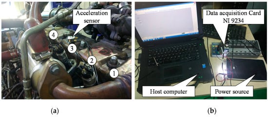 The test rig used for diesel engine misfire assessment: (a) Installation of the vibration sensor; (b) Data acquisition system.