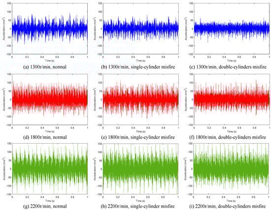 After denoising, a series of typical waveforms were obtained, as shown in Figure 4. It is seen that the vibration severity of the cylinder head shows obvious difference under different speed conditions. Meanwhile, it indicates that when the engine is in different misfire conditions, the time-domain vibration signal shows some differences under the same speed. This demonstrates that the classification and evaluation of misfire faults based on the vibration signal of the cylinder head are feasible, and the key point is to fully exploit the intrinsic characteristics of the signal.
