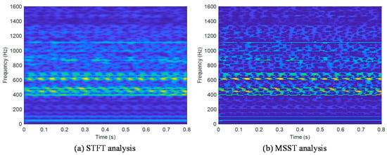 Similar to the synchrosqueezing transform (SST) [,], the MSST also belongs to the post-processing tool of conventional time–frequency analysis methods; for instance, the short-time Fourier transform (STFT). However, with the aid of a novel iterative procedure, it can effectively improve the time–frequency resolution of SST when addressing time-varying signals, and simultaneously presents a perfect signal reconstruction [].