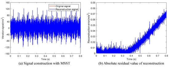 Then, the STFT method and MSST method were utilized to extract the hybrid domain characteristics of the signal. Taking the vibration signal of the No.2 cylinder at 2200 r/min as an example, the results of these two methods are illustrated in Figure 5. Compared with the STFT method, MSST can effectively remove the high-frequency noise components in the signal, and obviously suppress the diffusion of the characteristic frequency band. Consequently, for several characteristic frequency bands with the greatest energy concentration, the typical characteristic frequency could be obtained. Besides, the signal reconstruction result of the MSST method is presented in Figure 6. It is obvious that the absolute residual value is kept below 0.08 over the entire signal length, which demonstrates that the MSST-based feature extraction method has a stable signal reconstruction capability and does not lose the original characteristics of the signal.