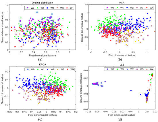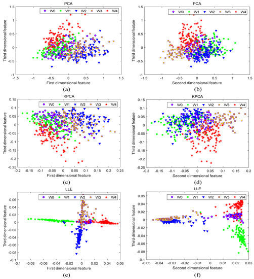 Figure 7a shows the sample distribution of the original feature set. It is seen that the original distribution has the following properties: large intra-class distance, small inter-class distance, and poor linear separability. These unfavorable properties make it difficult to achieve a good classification and evaluation of the samples. Figure 7b–d present the visualization results of these methods. Although the intra-class distance is reduced through the PCA and KPCA dimensionality reduction, the inter-class distance is not obviously improved. The LLE method can not only further reduce the intra-class distance, but also significantly increase the inter-class distance, exhibiting excellent clustering functions. In the first two dimensions, it can be seen from Figure 7d that the LLE can effectively separate W0 from W1, W2, W3, and W4, while W3 and W4 have some overlapping areas. Therefore, the dimensional reduction effects of more dimensions were investigated, and the results are illustrated in Figure 8. It shows that the PCA and the KPCA obtain similar results as the previous case. However, W3 and W4 have been well separated by LLE based on Figure 8e,f. The results of Figure 7 and Figure 8 demonstrate that the LLE method has the best dimensionality reduction effect compared with the other two methods. According to the Ref. [], the optimal embedding dimension d of the LLE algorithm equals the number of fault categories minus 1. Therefore, when applying the rule to this feature set, d is taken as 4 in consideration of five types of working conditions.