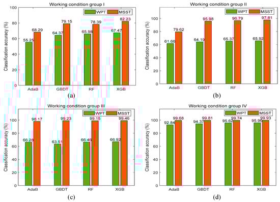 Misfire fault diagnosis of a diesel engine is a typical multi-classification problem. For this type of problem, ensemble learning is a suitable solution. According to existing studies, ensemble learning can promote the weak evaluator to a strong evaluator with an excellent generalization performance. Typically, AdaBoost (AdaB), the Gradient Boosting Decision Tree (GBDT), and Random Forest (RF) are the most frequently used ensemble learning algorithms. Moreover, the XGB algorithm improved based on GBDT has sprung up recently and has achieved state-of-the-art results when faced with various pattern recognition problems and competitions. Therefore, the XGB algorithm has been employed to implement accurate fault classification of diesel engine misfire, which can effectively avoid model overfitting. To verify the proposed MSST-based feature extraction method, wavelet packet transform (WPT) was utilized to extract the wavelet packet features. On this basis, by combining the MSST features and WPT features with the above four recognition methods, comparisons among eight different evaluation methods were made to verify the performance of the proposed method. For each working condition group, sixty percent of the total samples were selected to construct the training set, and the rest were chosen as the test set. The evaluator was trained on the training set, and the test was performed on the test set to obtain the classification accuracy. In order to make the classification results more reliable, each method was repeated 20 times to obtain the average diagnosis accuracy, and the classification results of four groups are shown in Figure 9.