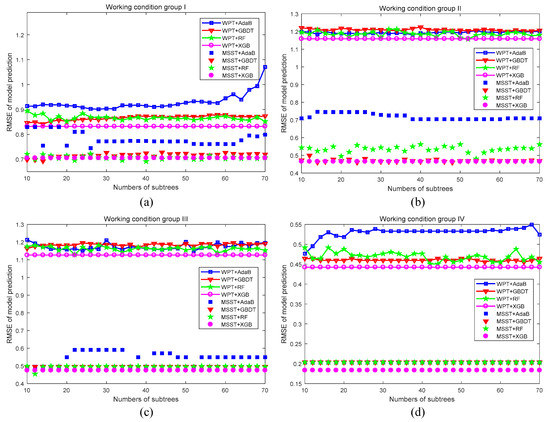 Meanwhile, in order to verify the robustness of the proposed evaluation method, the relationship between the model prediction root mean squared error (RMSE) and the number of evaluation subtrees was investigated. The corresponding RMSE curve results are shown in Figure 10. The RMSE describes the average evaluation accuracy, while the number of subtrees reflects the complexity of the model. In Figure 10a, for instance, the magenta solid line with a hollow circle characterizes the trend of the RMSE of the WPT-XBG evaluation method with the number of subtrees. Compared with the WPT-AdaB evaluation method, i.e., the blue solid line with a hollow square in Figure 10a, the WPT-XBG evaluation method achieves smaller RMSE with the same complexity of the model, i.e., number of subtrees. Therefore, Figure 10 reflects the relationship between the average evaluation accuracy and model complexity. It is seen from Figure 10 that the RMSE values of the four types of evaluation methods using MSST-based feature extraction are much smaller than the same recognition methods using WPT-based feature extraction, which proves that evaluation methods using MSST-based features can achieve a more stable evaluation performance. Meanwhile, Figure 10 also shows that the evaluation accuracy of XGB and RF is much better than that of AdaB and GBDT. It should be noted that when the model complexity is high enough, the evaluation robustness of RF is slightly better than XGB with the WPT-based feature extraction. However, this is at the cost of model over-fitting, making it difficult to guarantee the comprehensive performance for the misfire diagnosis of a diesel engine. According to Figure 10, the proposed MSST-XGB evaluation method for misfire fault diagnosis could obtain the minimum RMSE value with minimum number of evaluation subtrees. It demonstrates that the proposed method can ensure the most stable evaluation performance under the minimum model complexity compared with other methods, and can also effectively prevent the model from overfitting. In conclusion, the proposed evaluation method has the best generalization performance and robustness and an excellent ability to suppress the model overfitting.