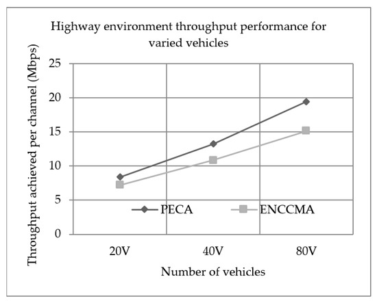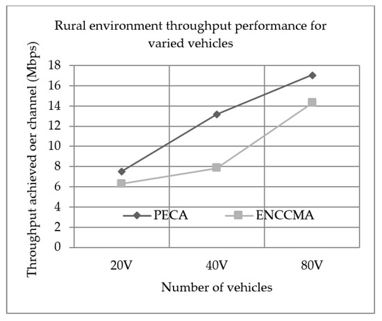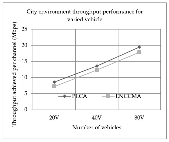 Experiments were conducted to evaluate the performance of PECA and ENCCMA in terms of throughput achieved per channel for City, Highway and Rural as shown in Figure 1, Figure 2 and Figure 3, respectively, considering different vehicle densities. It is seen from Figure 1, the PECA improves throughput by 16.17%, 9.25% and 8.26% considering 20, 40 and 80 vehicles respectively over ENCCMA. An average throughput improvement of 11.23% was achieved by PECA over ENCCMA for city environment. As seen from Figure 2, the PECA improves throughput by 14.12%, 18.01% and 21.93% considering 20, 40 and 80 vehicles, respectively, over ENCCMA. An average throughput improvement of 18.026% is achieved by PECA over ENCCMA for highway environment. Figure 3 shows the throughput performance for a rural environment. As seen from Figure 3, the PECA improves throughput by 16.42%, 40.38% and 16.17% considering 20, 40 and 80 vehicles respectively over ENCCMA. An average throughput improvement of 24.32% is achieved by PECA over ENCCMA for a rural environment. The overall result achieved shows that PECA performs significantly better than ENCCMA considering varied vehicles and different environmental conditions, which shows the proposed model is adaptive in nature. However, the significant outcome attained by proposed PECA over existing ENCCMA is due to an efficient collision detection method under a shared channel environment. Further, based on collision likelihood information the slots are selected that maximize the system throughput.