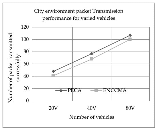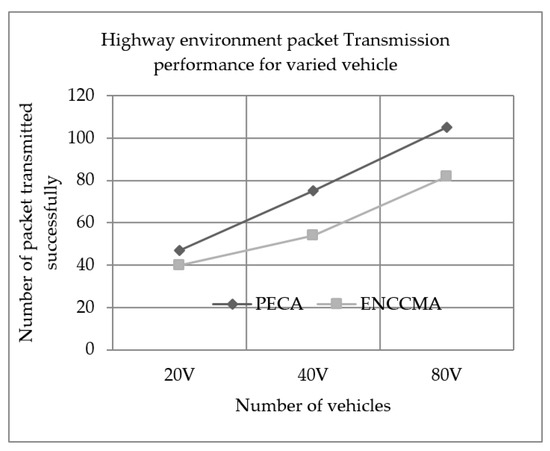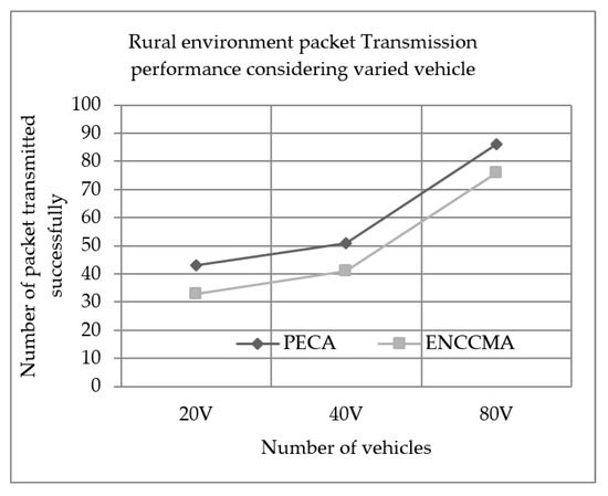 Experiments evaluated the performance of PECA and ENCCMA in terms of successful packet transmission for City, Highway and Rural, as shown in Figure 4, Figure 5 and Figure 6, respectively, considering different vehicle densities. As seen from Figure 4, the PECA improves packet transmission by 14.58%, 11.06% and 6.54% considering 20, 40 and 80 vehicles respectively over ENCCMA. An average packet transmission improvement of 10.93% is achieved by PECA over ENCCMA for a city environment. As seen from Figure 5, the PECA improves packet transmission by 14.89%, 28.00% and 21.90% considering 20, 40 and 80 vehicles respectively over ENCCMA. An average packet transmission improvement of 21.59% is achieved by PECA over ENCCMA for a highway environment. The Figure 6 shows the packet transmission performance for a rural environment. It is seen from Figure 6, the PECA improves packet transmission by 23.25%, 19.60% and 11.62% considering 20, 40 and 80 vehicles respectively over ENCCMA. An average packet transmission improvement of 18.16% is achieved by PECA over ENCCMA for a rural environment. The overall result achieved shows that PECA performs significantly better than ENCCMA considering varied vehicles and different environmental conditions in terms of packet transmission. Therefore, the significant outcome attained by the proposed PECA over existing ENCCMA is due to the efficient collision detection method. Thus, it aided in minimizing collision and maximize system throughput. As a result, the packet transmission in the network improved.