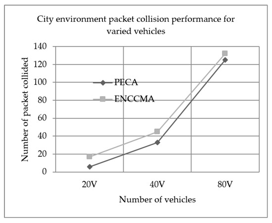 We evaluated the performance of PECA and ENCCMA in terms of packet collision for City, Highway and Rural as shown in Figure 7, Figure 8 and Figure 9, respectively, considering different vehicle densities. As seen from Figure 7, the PECA reduces packet collision by 64.70%, 26.66% and 5.3% considering 20, 40 and 80 vehicles respectively over ENCCMA. An average packet collision reduction of 32.22% is achieved by PECA over ENCCMA for a city environment. As seen from Figure 8, the PECA reduces packet collision by 27.77%, 32.81% and 15.58% considering 20, 40 and 80 vehicles respectively over ENCCMA. An average packet collision reduction of 25.39% is achieved by PECA over ENCCMA for a highway environment. Figure 9 shows the packet collision performance for a rural environment. As seen from Figure 9, the PECA reduces packet collision by 51.51%, 33.76% and 08.53% considering 20, 40 and 80 vehicles respectively over ENCCMA. An average packet collision reduction of 31.27% is achieved by PECA over ENCCMA for rural environment. The overall result achieved shows that PECA performs significantly better than ENCCMA considering varied vehicles and different environmental conditions in terms of packet collision. However, the significant outcome attained by the proposed PECA over the existing ENCCMA is due to the efficient back off method post identifying collision in the network under a shared channel environment. Then, the average overhead is computed and updated in the channel allocation process under the shared channel environment. Thus, it aided in minimizing collision in the network.