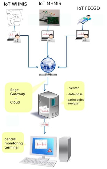 - In the permanent monitoring center, the specialist doctor investigates the results with possible alerts stemming from highlighted probable pathologies resulting from the pre-processing’s run on the central server, as is shown in Figure 2.