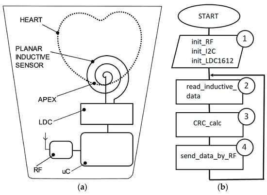 Experimental model block scheme: (a) Flowchart of the embedded software of inductive data acquisition and data transfer (b).
