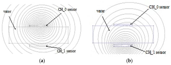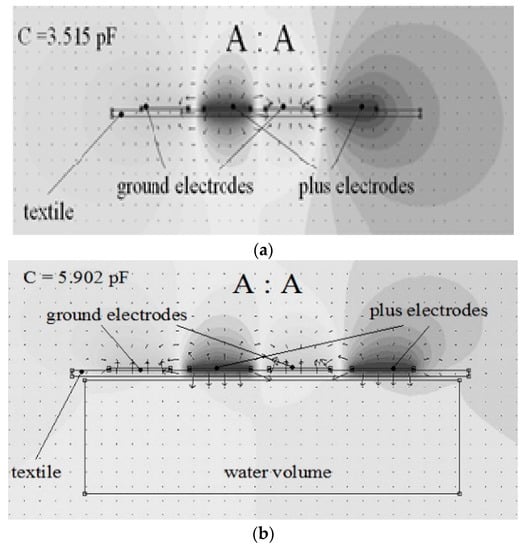 Reference [] presents the influence of a water probe on a planar capacitive sensor as simulation results using Beladraw 1.0 software (Figure 4a,b).