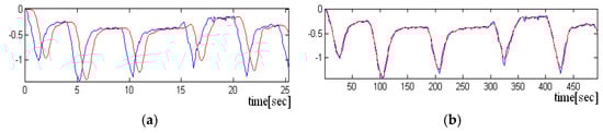 Representation of the delay between the input signal (with blue) and the filtered signal (with red) (a) Representation of the overlap of the input signal and the filtered signal (the delay was eliminated) (b).