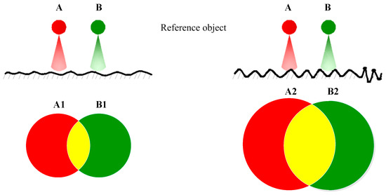 According to the analysis in reference [7], it can be known that the reflected area of the red and green points vary due to the different surface roughness. If the roughness increases, the reflected area will be larger and the aliasing area of two points will also be larger. The virtual images of the red and green points reflected by the surface with different roughness are illustrated in Figure 1.