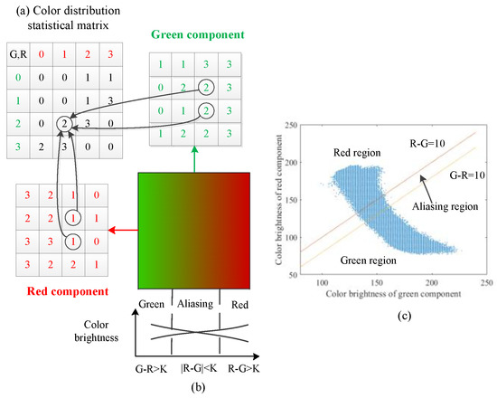 In the aliasing images, the brightness value of the green component decreases gradually from left to right, while the value of the red component increased from left to right, as illustrated in Figure 3b. So in the middle of the image, there is an aliasing region whose absolute value between the red and green brightness values is small. On both sides of aliasing region, there are two pure color regions with a large color difference. Therefore, if we set a threshold, all the pixels in the image can be preliminarily divided into three regions according to the color difference, as shown in Figure 3c. Specifically, Figure 3c is the CDSM of the image shown in Figure 3b, the blue points represent the pixels. If the threshold is set to be 10, the pixels in this image can be preliminarily segmented into red, aliasing and green regions. Then, the average brightness values of all the pixels in each region can be obtained as initial cluster centers. In summary, the process of initializing cluster centers is shown in Algorithm 1.