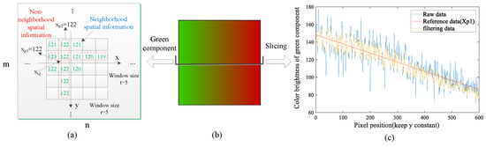As shown in Figure 4a, in the direction of x, the green component of the aliasing image presents a linear decrease tendency. And in the direction of y, each column pixels basically has the same brightness value. Thus, this non-neighborhood spatial information in two directions can be used to improve the segmentation performance. It is not difficult to find that the non-neighborhood spatial information used in this task is to set the size of the window containing spatial information to an extreme case, which can make full use of the prior knowledge in the aliasing image. In addition, the neighborhood spatial information needs to calculate the filtering value of central pixel window by window, while the proposed non-neighborhood spatial information can directly obtain the filtering values of all the pixels in the non-neighborhood window, which greatly improves the efficiency of FCM algorithm. As shown in Figure 4a, the neighborhood spatial information needs to calculate 25 times through window movement to obtain the filtering values of all the pixels, while the proposed non-neighborhood spatial information only need five times.