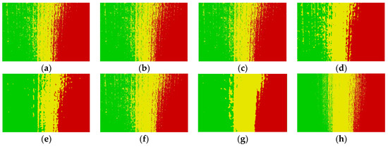 The imaging results are illustrated in Figure 6. It can be found that the aliasing regions appear in the middle of the surface images, and the image aliasing degree strengthens as the roughness increases, but due to the influence of surface textures and other machining marks, the aliasing images have a high noise level. In general, when the surface roughness is larger, the noise level of the aliasing image will be higher. Thus, a robust FCM algorithm is proposed to analyze this aliasing effect. Based on the clustering results, we design an index which is significantly correlated with the surface roughness.