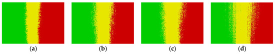 In the process of measurement, the red and green points in Figure 1 are designed as a block, as shown in Figure 2a. From the above analysis, it can be found that the aliasing area increases monotonically as the roughness increases. Based on this theory, the feature index correlated with roughness can be designed by evaluating the aliasing effect. However, in the previous work, researches only count the number of pixels with the same red and green brightness values [21], or calculate the absolute difference between the brightness values of red and green components [7] to characterize the aliasing images. These approaches are obviously not comprehensive and reasonable, since the correlation between pixels and the spatial information of pixels are ignored. In this study, FCM algorithm is employed to analyze the aliasing images. The FCM is suitable for describing the uncertainty of the aliasing image, as shown in Figure 2b, and extracting more appropriate image feature index. However, the segmentation performance of conventional FCM will be influenced when dealing with the high noisy aliasing images. Thus, a robust FCM algorithm with non-neighbor spatial information (FCM_NNS) is presented to address this problem.