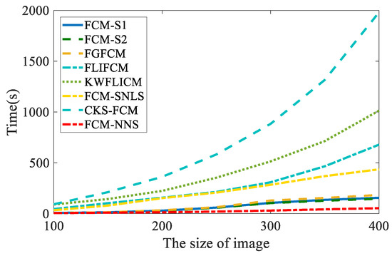 The results on one synthetic image and thirty aliasing images are discussed in this section. This study compares the performance and the efficiency of FCM_NNS with seven algorithms, such as FCM_S1 [43], FCM_S2 [43], FGFCM [38], FLICM [35], KWFLICM [36], FCM_NLS [40] and CKS_FCM [46]. Then, the effectiveness of the proposed C index and F index are validated by the comparisons between nine roughness indexes.