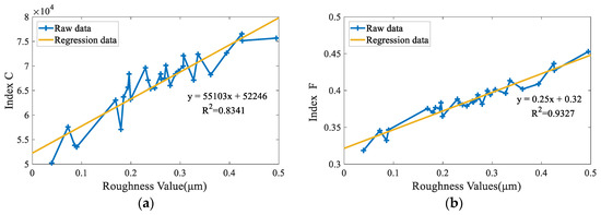 It can be found from Table 4 that Ga, F1 and En have poorer fitting effects than the other four color information indexes, which proves the effectiveness of the color information-based indexes. Then, the results in Figure 18, Table 4 and Table 5 show that the proposed FCM_NNS based F index is strongly correlated with surface roughness even if aliasing images are at high noise levels. The value of R2 for FCM_NNS based F index is higher than other compared roughness indexes, which can verify the feasibility and superiority of the proposed surface roughness measurement. The proposed FCM_NNS can not only preserve robustness and noise insensitiveness, but also preserve effective fuzzy details in aliasing images, so the values of R2 for FCM_NNS-based C index and F index are larger than that values of other compared clustering algorithms. Moreover, F index is designed based on the fuzzy information in the segmentation images, which has better fitting effect than C index.