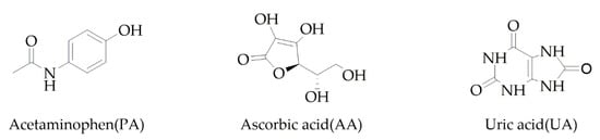 Acetaminophen, Ascorbic acid and Uric acid (Figure 1) play an important role in humans’ life. Acetaminophen (N-acetyl-p-aminophenol or paracetamol (PA)) is an antipyretic and analgesic drug commonly used against arthritis, headache, muscle aches, menstrual cramps and fevers [1]. A high amount of PA can cause the accumulation of toxic metabolites, leading to severe and sometimes fatal hepatotoxicity and nephrotoxicity [2]. Ascorbic acid (AA) is a vitamin commonly present in many biological systems and in multivitamin formulations. It is widely employed to provide an adequate dietary intake and as an antioxidant [3]. Its excessive dose may cause headache, trouble sleeping, gastrointestinal discomfort and flushing of the skin [4]. Uric acid (UA) is the primary product of purine metabolism [5]. Continuous monitoring of UA in the body fluid is essential since its abnormal concentration levels lead to several diseases, such as hyperuricemia and gout [6]. Other diseases, such as leukemia and pneumonia are also associated with enhanced urate levels.