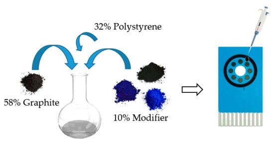 The nanomaterial SPCE/modifier was produced in the form of a conductive ink-like composite. The corresponding modifier, graphite and polystyrene were thoroughly mixed with mesitylene for 2 h (Figure 2) using a magnetic stirrer. After that, 2 min of sonication was performed in order to obtain a medium thick solution. The ink-like composite was dropped 5 µL onto the surface of a screen-printed carbon electrodes (SPCE) and dried at 40 °C for at least 1 h in order to remove the solvent. Once the sensor was prepared, the next step is an activation [33,34] in order to enhance sensing performances of modified ink (Figure 3 displays the typical gain achieved after activation). Electrochemical activation consisted of 10 repetitive voltammetric cycles at 50 mV·s−1 between 1.5 and −1.5 V using 10 mM H2O2 in phosphate buffer (pH 7). After activation, electrodes were rinsed with deionized water and dried in air.