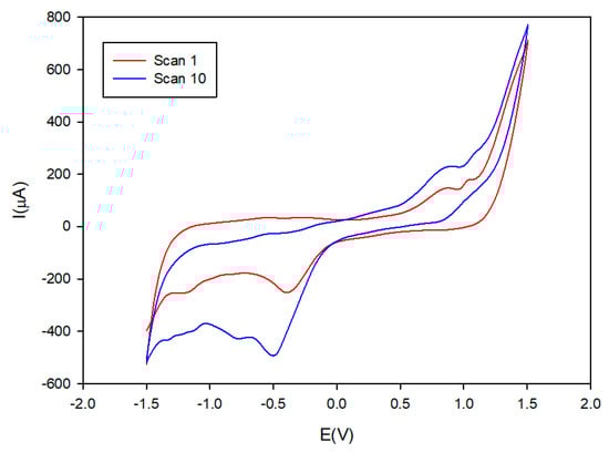 Comparison of the Cobalt (II) phthalocyanine/SPCE-Ink before (scan 1) and after (scan 10) the activation. Electrochemical activation consists of 10 repetitive voltammetric cycles at 50 mV·s−1 between 1.5 and −1.5 V using 10 mM H2O2 in phosphate buffer (pH 7). After activation, electrodes were rinsed with deionized water and dried in air.