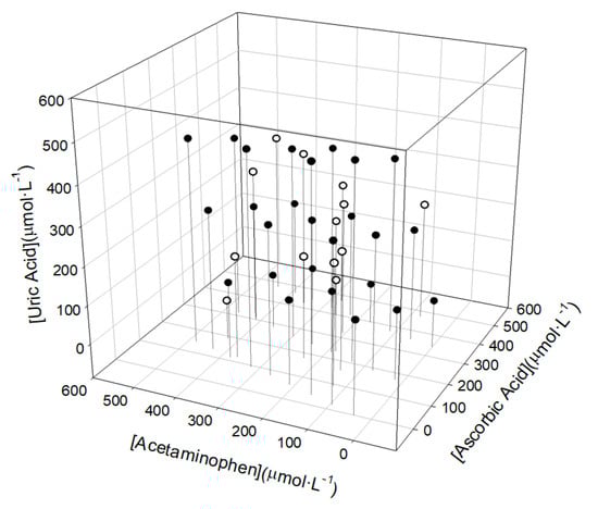 As can be observed in Figure 8, the studied ranges were linear for all the compounds. Therefore, for the ET development the concentration working range was from 0 to 500 µmol·L−1 for Acetaminophen, Ascorbic acid and Uric acid. The linear relationship and the calibration equations for each sensor are represented in Table 1.