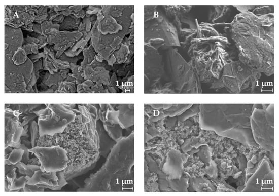 A SEM characterization was performed in order to investigate the spatial distribution of the ink-nanoparticles and to verify if the particles were all on the external surface or in the inner layers. As can be observed in Figure 5, the different modifiers are distributed quasi-homogeneous between the graphite layers. The size of the nanoparticles is below 1 µm.