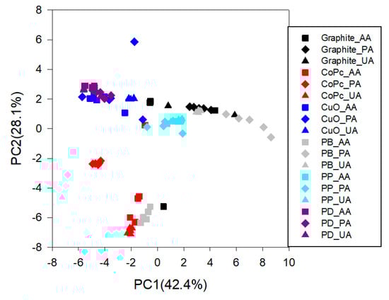 The four aforementioned modifications used to perform this work, were selected among six modifications candidates (Graphite, Cobalt(II) phthalocyanine, Copper oxide (II), Prussian blue, Polypyrrole doped and Palladium) to construct the sensor array. This selection facilitates the modification in form of an ink. In addition, these nanomaterials are the ones with extended experience in the laboratory (although used in a different electrode format, the epoxy-graphite composites [38]). The behaviors of these sensors for each compound were evaluated individually. Once the voltammograms were collected, a preliminary qualitative analysis was performed in order to evaluate the complementary of the sensors. The chemometric tool used was PCA. The information collected in this case to perform the PCA calculation was the unfolded data. If electrodes are redundant they would appear superimposed in the PCA graph, while a different response will manifest in their separation. As can be seen in Figure 6, each sensor showed performance in different regions. This fact accomplishes a relevant role in the execution of the electronic tongue, justifying the good contribution of the four prepared electrodes in the sensor array. In addition, this analysis made us discard from the sensor array system the Palladium and Polypyrrole sensors, because they were not able to provide distinction between the different substances (Figure 6). According to these criteria, the other modifiers could be classified as good candidates because they provided a wide range of variability between the substances. In addition, the vast majority of the signals were far away from zero, meaning they provide useful information to the system.