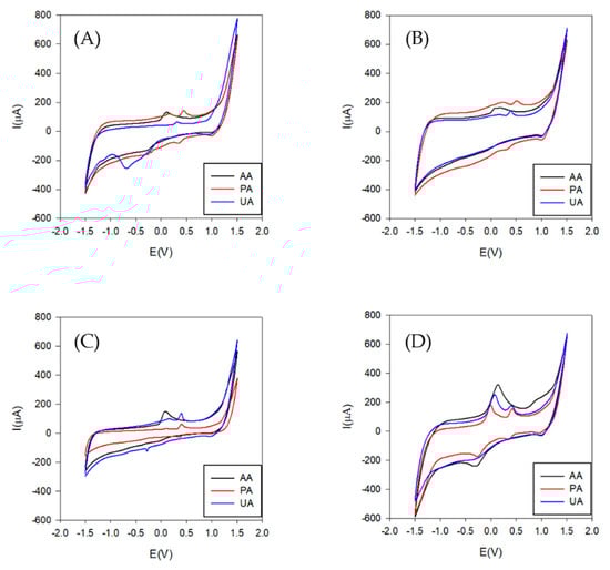 Voltammetric response for Acetaminophen (PA), Ascorbic acid (AA) and Uric acid (UA) using the four finally selected inks. (A) Cobalt (II) phthalocyanine/SPCE-Ink; (B) Prussian blue/SPCE-Ink; (C) Graphite/SPCE-Ink; (D) Copper oxide (II)/SPCE-Ink. The range of potential was from −1.5 to 1.5 V. The scan rate was 50 mV·s−1 and step rate of 9 mV. A 300 µmol·L−1 individual solution was employed for the four modified screen-printed electrodes.