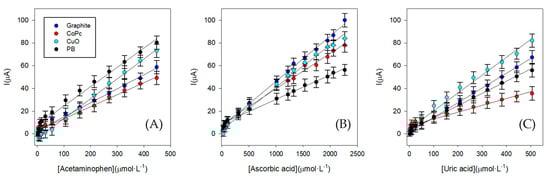 Calibration curves for three replicates (n = 3) to determine the concentration working range for the three compounds under study for the four modified screen-printed electrodes. (A) Acetaminophen, (B) Ascorbic acid, (C) Uric acid.