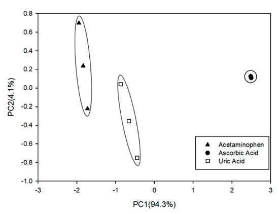 Score plot of the two components obtained after Principal Component Analysis (PCA) analysis. Five replicates for each sensor were done determining the three compounds of interest: Acetaminophen, Ascorbic acid and Uric acid.