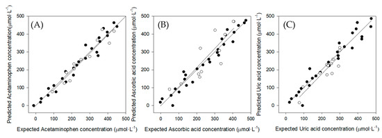 Obtained vs. expected concentrations results plots for the training set (black dots) and the testing set (white dots) for (A) Acetaminophen, (B) Ascorbic acid and (C) Uric acid.