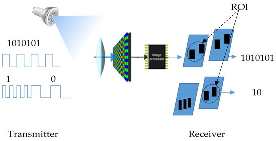 The decoding operation comprises image processing functions of the captured color pixel information. Depending on the image sensor architecture, this could be in the form of spatial or temporal data from the captured image, depending on whether the global or rolling shutter image sensor is used. With the global shutter image sensor, the entire image is captured at once. This architecture has the advantage of spatial modulation with the MIMO scenario. In contrast, the rolling shutter image sensor mode includes multiple captured states at different times in a single captured image. This architecture has the advantage of an improved data rate compared with the global shutter mode. The OCC receiving signal in this architecture is color pixel rolls, which arise from the ON–OFF light signal of the optical transmitter. By applying image processing algorithms for color classification, the receiver can decode the embedded data following the color or pixel pattern. This can be in the form of color cell status in the global shutter image sensor or frequency separation from image rolls in the rolling shutter image sensor.
