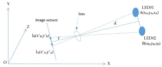 where X, Y, and Z are coordinates of the LEDs in the real world, which are represented with A and B; f is the camera focal length. In addition, I1I2 is the distance between the two LEDs’ image in the image sensor with the x’ and y’ coordinates, which is given by Equation (2).