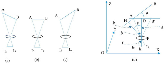 As shown in Figure 3d, with the assumption that A and B are known LEDs, the image of AB on the OXY plane is AB’, the image of AB on the image sensor is IAIB, the distance from AB to the image sensor can be defined by pinhole camera approximation, and is d. However, the desired value is h, which can be calculated as follows: