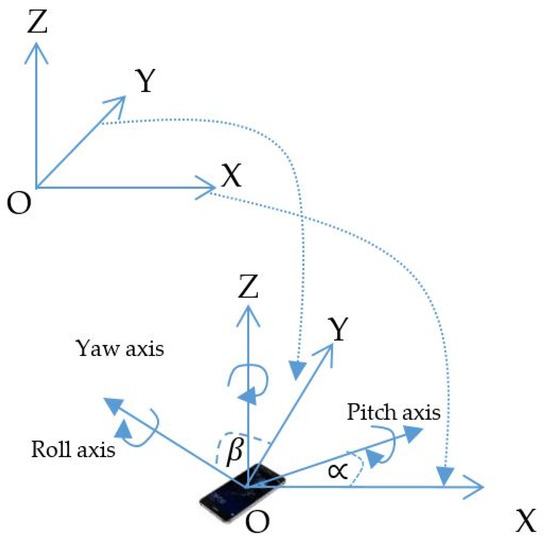 where are the rotation vectors of the x-world coordinate axis and the y-world coordinate axis, respectively, given by Equation (8). β and are the rotation angle of image sensor on Roll axis and Pitch axis.