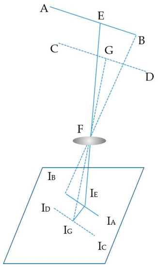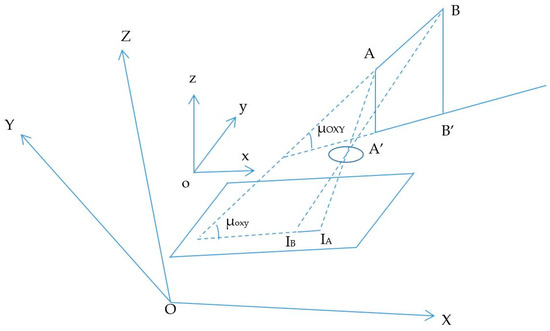 In the image sensor plane (oxyz), the coordinates of IE are defined by the intersection point between IAIB and the perpendicular line to IAIB traveling through the image sensor center point, given by Equation (14).