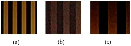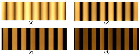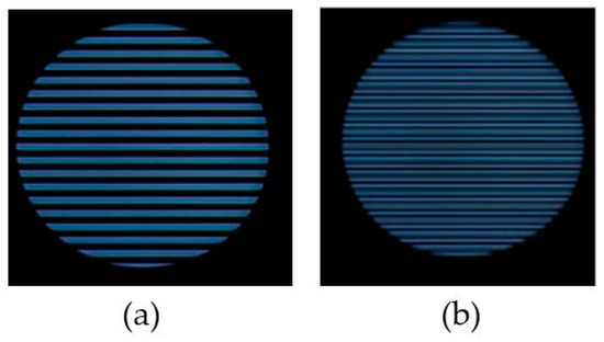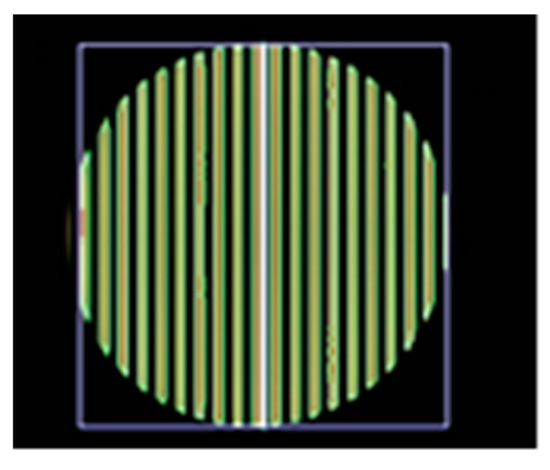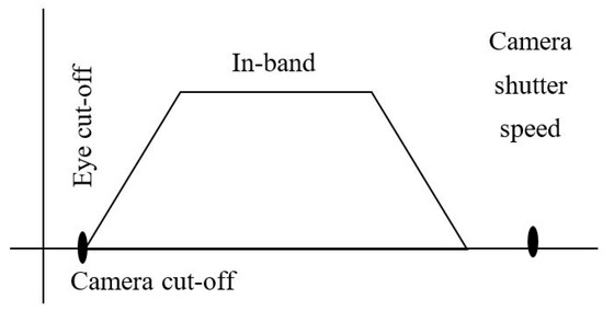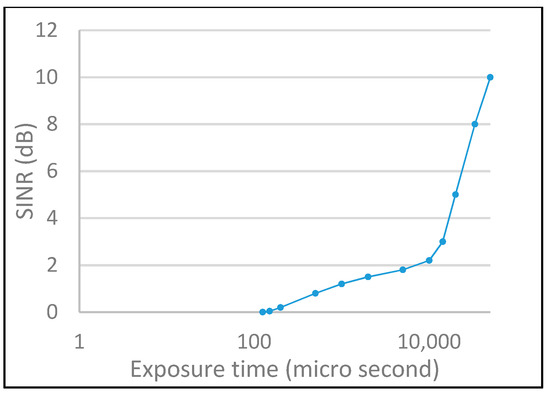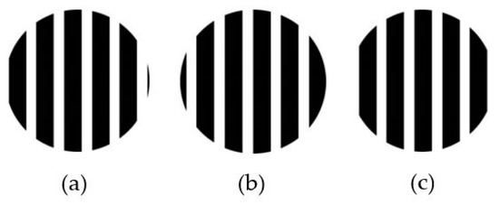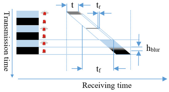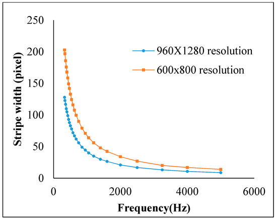 The on–off signal is presented by black and white stripes of occupied pixels in the captured image. The width of the stripes depends on modulation frequency. With a square waveform signal at a frequency fs, the duration of the on–off state, tf, will be 1/(2fs) seconds for a pair of black and white stripes. To generate one stripe in hs pixel rows with readout time, the width of the stripe pair ws, in millimeters, is defined by Equation (20).