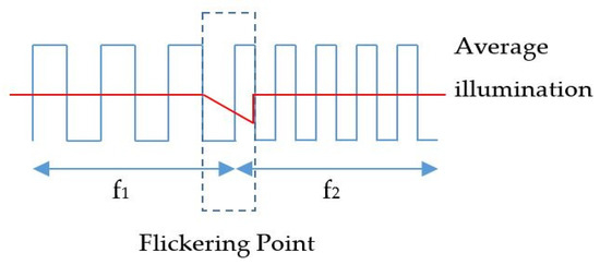 Flickering is the first consideration in VLC deployment, which is defined as one of the most important factors of the transmitter. The frequency separation is defined by the difference in width between the black and white stripes, which is created by the on-and-off signal duration of the LED, as shown in Figure 8. If there is a big variation in the average illumination, the flickering point will be recognized by the human eye, as shown in Figure 9. The higher the frequencies that are applied, the more flickering will occur because of the larger distance of the frequency switch. This is a tradeoff between the embedded rate and the flickering index of the flickering point.