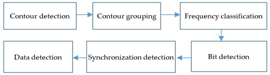 The proposed OCC receiver architecture is based on the rolling shutter mode of the image sensor. The modulated optical signal is captured and converted to a color pixel array by the camera. The out stream is a buffer at which the output image data are dumped at each sampling frame. The data decoding includes light conversion, memory access time, and data image processing. The total time must be less than 1/(frame rate). If this value is larger than the buffer, the memory will overflow. The memory access time is dependent on the image type format and resolution. To minimize the decoding time, we applied a non-compressing image method, based on the gray-scale YUV color space. Figure 10 presents the data decoding with image processing. The gray-scale image data from the buffer are dumped to bitmap data using a two-dimensional array to minimize the processing of contour detections that result from the color conversion.