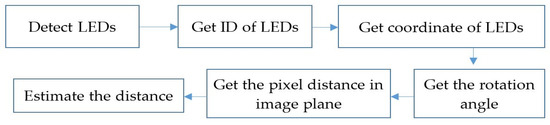The proposed scenario of distance estimation based on the image sensor is shown in Figure 2. The scheme uses at least two LEDs, which continuously broadcast their coordinate information using VLC technology. From the captured coordinate information on the image sensor, the distance between the two LEDs is given by Equation (5).