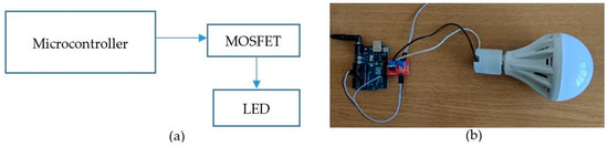 The distance and localization estimation performance of the proposed scheme was evaluated by applying the experiment implementation circuit for the transmitter, including the microcontroller LED driver and the LED, as shown in Figure 19. The receiver comprises a smartphone rolling shutter camera and an application that can configure the camera shutter speed.