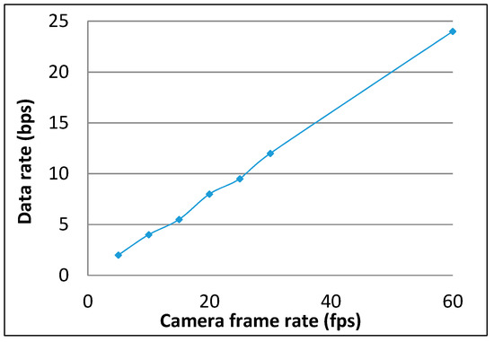 The data rate of the proposed 2FSOOK modulation scheme at different configured camera frame rates is shown in Figure 20. The system data rate is proportional to the camera frame rate. However, high camera frame rates create a problem with decoding processing. The experiment performed on the current commercial smartphone at more than 20 fps is not reliable with respect to the processing capability, due to the cache memory. The buffer is overloaded in some scenarios where the shot noise is high. Table 3 provides the configuration of the experiment that guarantees data encoding and decoding.
