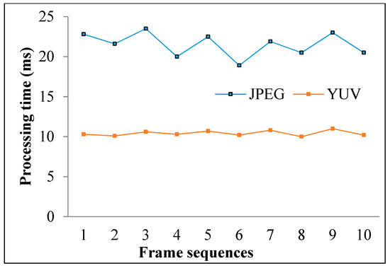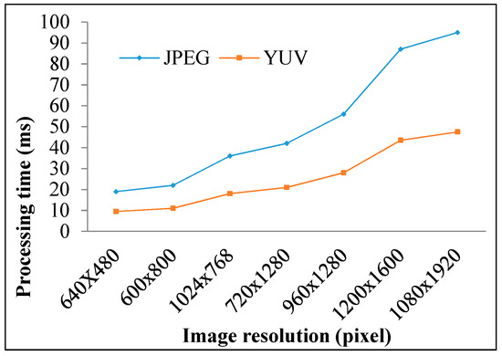The roll stripes of subcarrier frequencies of 2FSOOK are shown in Figure 21, where the 2 and 4 kHz OOK frequencies are embedded. In this experiment, the implementation of a 17 cm diameter of LED and the power density distribution analysis of two neighbors LED optical pulse at 2 and 4 kHz OOK frequency are shown in Figure 22. The distance from the transmitter to the receiver can be at 2 m for reliable decoding data with identified stripes in the captured image. At a larger distance, the separation distance between the contours is not stable, and the system encounters an error resulting from missing stripe widths, which arise as a result of the rolling mechanism limitation. Therefore, to achieve high accuracy and minimize the complexity of error correction, the maximum number of rolling contours should be guaranteed for the demodulation of one frequency. The number of contours depicts the maximum communication range between the transmitter and the receiver. This means that with FSK modulation, the position of the receiver can change dynamically, whereas the maximum communication range will be recognized when the number of contours is more than one. In our implementation, we configure the image sensor with a resolution of 600 × 800 pixels and a maximum communication range of 2 m. The higher the resolution configuration, the longer the distance we can achieve for communication. However, this setup faces processing time issues on the device. The performance with regard to processing capability with respect to image formats, resolution configuration, and the rolling signal pixel width of 2FSOOK are shown in Figure 23, Figure 24 and Figure 25.