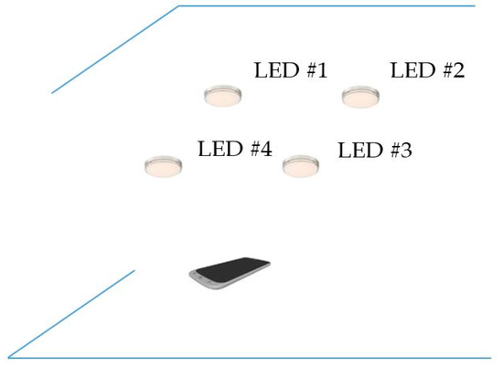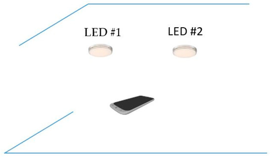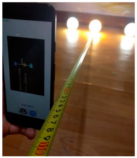 A photograph depicting the experimental implementation of the proposed scheme is presented in Figure 28, portraying two OCC LEDs among three illumination LEDs. The coordinates of the two OCC LEDs are mapped with the index table through LED-ID [44] or by receiving the coordinates directly from the LED signal. In this scenario, we applied the LED-ID architecture, where there is 5-bits ID. The data are broadcast by the LEDs, which are 17 cm apart, and received by the rolling shutter camera in the smartphone. The coordinates of the LEDs are queried by a server via a Wi-Fi connection. With regard to the camera focal length, this is one of the most important parameters for distance estimation using the pinhole camera approximation. It should be defined initially for the estimation processing. Its value can be obtained from the Camera API (for example, CameraIntrinsics or CameraCharacteristics library for Android devices). It can also be defined initially through manual configuration using a built-in database. The focal length of existing cameras will be surveyed and adapted for the application. By extracting the device model from the camera API, which most existing devices can support, we can match the device camera focal length from the database and then configure these values.
