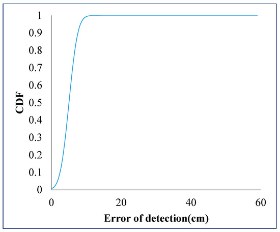 For the centralization error rate analysis of the image sensor photography technique, the experiment implementation only considered the optical camera communications and pinhole camera approximation calculation. The camera focal length value is calibrated by manual configuration to minimize the error value. In addition, then, the rotation angle between the mobile device and the LED plane, which can be extracted from the gyroscope sensor, is also considered with the fixed scenario. The rotation angle with the gyroscope sensor was expected to be a minimum of 2 degrees in Ref. [45]. We conduct the experiment by measuring 1,000 times in order to calculate the average across mean and variance. The performance of distance estimation is shown in terms of the cumulative distribution function (CDF) results in Figure 29. It can achieve an average estimation error of 10 cm, which arises from the error of the LED center point detection due to the projected contours.